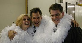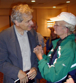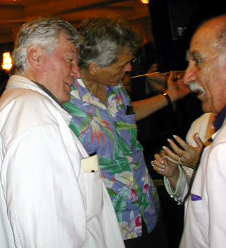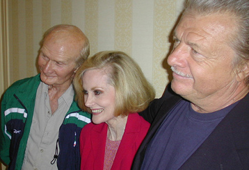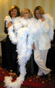 |  Exclusive DSO Feature: Dark Shadows Festival 2000 The 2000 annual meeting of Dark Shadows stars and fans took place July 7, 8, and 9 at the Los Angeles Airport Marriott -- and Dark Shadows Online was there. Celebrity guests included David Selby, Mitch Ryan, Nancy Barrett, Lara Parker, Kathryn Leigh Scott, Louis Edmonds, John Karlen, Marie Wallace, Roger Davis, Diana Millay, Christopher Pennock, James Storm, Dennis Patrick, and Paul Michael. (Mr. Michael was accompanied by his lovely longtime companion, Marion Ross, who didn't appear on Dark Shadows, but is well-known as "Mrs. C.", the mom on Happy Days.) Activities included Q&A sessions with the stars, an autograph line, a costume gala in which fans dressed up as their favorite characters, memorabilia auctions, and video and film presentations--including the film I, and a surprise treat: a portion of a recently rediscovered US Steel Hour TV movie starring Diana Millay. Actors took the stage Throughout the weekend, the actors appeared on stage in groups to answer questions from the fans. Several actors also took to the stage solo to entertain the audience. David Selby read excerpts from his two books, In & Out of the Shadows, (on Saturday) and My Mother's Autumn (on Sunday). Christopher Pennock followed suit, hilariously performing the story portrayed in his comic book, Fear & Loathing on Dark Shadows. Marie Wallace read a humorous vampire tale, The Vampire in His Closet, by Heather Graham); John Karlen read a story in character as Willie Loomis (Secret Room Soliloquy, written by fan and Festival Committee member Mary E. Overstreet); and Lara Parker read poems from her mother's book, Bugs and Other Critters, and described an outline she hopes to turn into the next Dark Shadows novel, titled Angelique's Vengeance. The story, set just after the series left the air, features a lovely reincarnation of Angelique, a band of gypsies, and of course, Barnabas Collins. Displaying musical talents he never exercised on DS, James Storm entertained the crowd on Sunday afternoon singing set of country songs which are featured on his new CD, Shadows of a Storm. And the festivities were capped off by a musical show starring Nancy Barrett at the traditional banquet Sunday night. On Saturday, Kathryn Leigh Scott discussed the books published by her company, Pomegranate Press. One of the newest, The Charlie's Angels Casebook, was a big hit at the Pomegranate table. (Charlie's Angels has at least two Dark Shadows connections: Kate Jackson started her TV career on DS before landing the featured role of Sabrina on Charlie's Angels, and her angelic castmate Jaclyn Smith was married to DS star Roger Davis while DS was on the air. In fact, she was even considered for the part of Victoria Winters.) Pomegranate has also published a number of Dark Shadows-related books, including The Dark Shadows Movie Book, The Dark Shadows Collectibles Book, and the newly updated Dark Shadows Almanac: Millenium Edition. DS stars joined the Collinsport Players Each year, the Collinsport Players acting troupe performs sketches based on DS. This time around, however, there was a delicious twist: On Saturday night, members of the original DS cast took part in "The Spy Who Bit Me," in which a very different "cousin from England" shows up at Collinwood: sassy, sexy Austin Powers (played by the skit's author, Richard Halpern). Joining the Collinsport Players was Lara Parker, as Mrs. Evil (Dr. Evil's widow), Diana Millay as Laura Collins, John Karlen as Willie Loomis -- and Caitlyn Hawkins (Lara Parker's daughter, playing Mrs. Evil's offspring). On Sunday, "Cliff Notes IV: On A Dark Night You Can Live Forever," written by Jonathan Harrison, was performed. In this skit, a cross between DS and the Barbra Streisand classic "On a Clear Day You Can See Forever," Barnabas tried to change Maggie into his beloved Josette, only to find her possessed by someone else.... Nancy Barrett and Mitch Ryan each made their Q&A Festival debuts this year, on Saturday. Mr. Ryan had never attended a Fest, before taking the stage for a cast reunion on Saturday. And Miss Barrett had performed musical shows at past Fests, but on Saturday afternoon, for the first time she took the stage with her on-screen uncle, Louis Edmonds, and took questions from the audience. She told the crowd she had spoken with DS creator Dan Curtis earlier that day, and that he had confirmed he's working on a new Dark Shadows stage musical. Later that afternoon, Miss Barrett also joined the cast reunion, which she brought to a humorous ending: A fan told her she was the best screamer on the show, and asked how she did it. To answer, she let out a blood-curdler. The following behind-the-scenes photos are DSO exclusives:  | Dennis Patrick signs an autograph for a fan. |  | Chris Pennock prepares to read from his comic "Fear and Loathing on Dark Shadows." |    | During the encore to her musical show, Nancy Barrett used a long boa as a prop. After the show, backstage, it was a popular prop for photos. Above: Nancy shares the boa with the show's musical director, Steven Silverstein, and its producer, Craig Hamrick. Then Kathryn Leigh Scott and Lara Parker get into the act. And finally, Diana Millay tries the boa on for size. |  | David Selby and Louis Edmonds chat between events. |  | Louis Edmonds, Nancy Barrett, and John Karlen pose for a photo as Louis and Nancy prepare to take the stage for a Q&A. | | Fest newcomer Mitchell Ryan talks to Paul Michael after the on-stage cast reunion. | | Marion Ross, best known as Happy Days' Mrs. Cunningham, waits for her longtime companion, Paul Michael, as he takes part in the DS cast reunion. |  Dark Shadows © Dan Curtis Productions. All rights reserved. Dark Shadows Online © 2004: Craig Hamrick/Broadway Media Services Inc. | | Visit the rest of Dark Shadows Online | TV Series Behind-the-scenes history Cast Bios, photo galleries, and exclusive feature articles Collectibles Photos and facts about DS t
